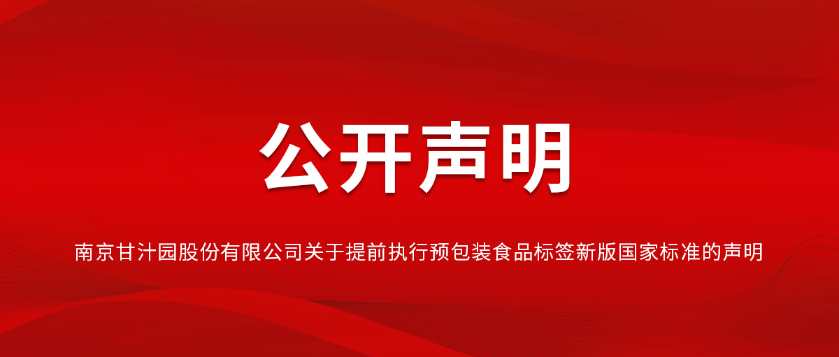 南京甘汁园股份有限公司关于提前执行预包装食品标签新版国家标准的声明