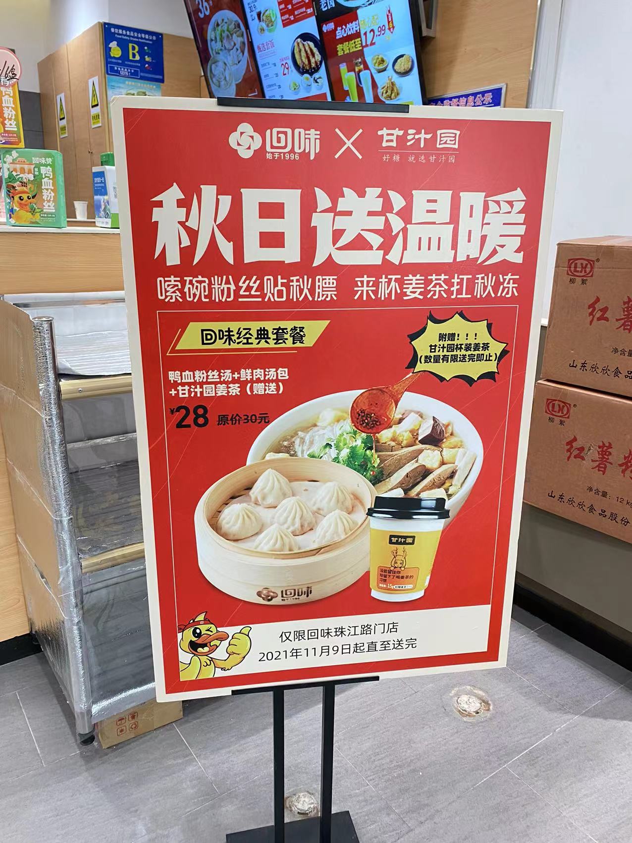 面对凛冽寒风,甘汁园联合回味鸭血粉丝汤及时推出了跨界送温暖活动,为南京的朋友送来冬日的一杯姜茶,带去暖暖的温情与满满的祝福。