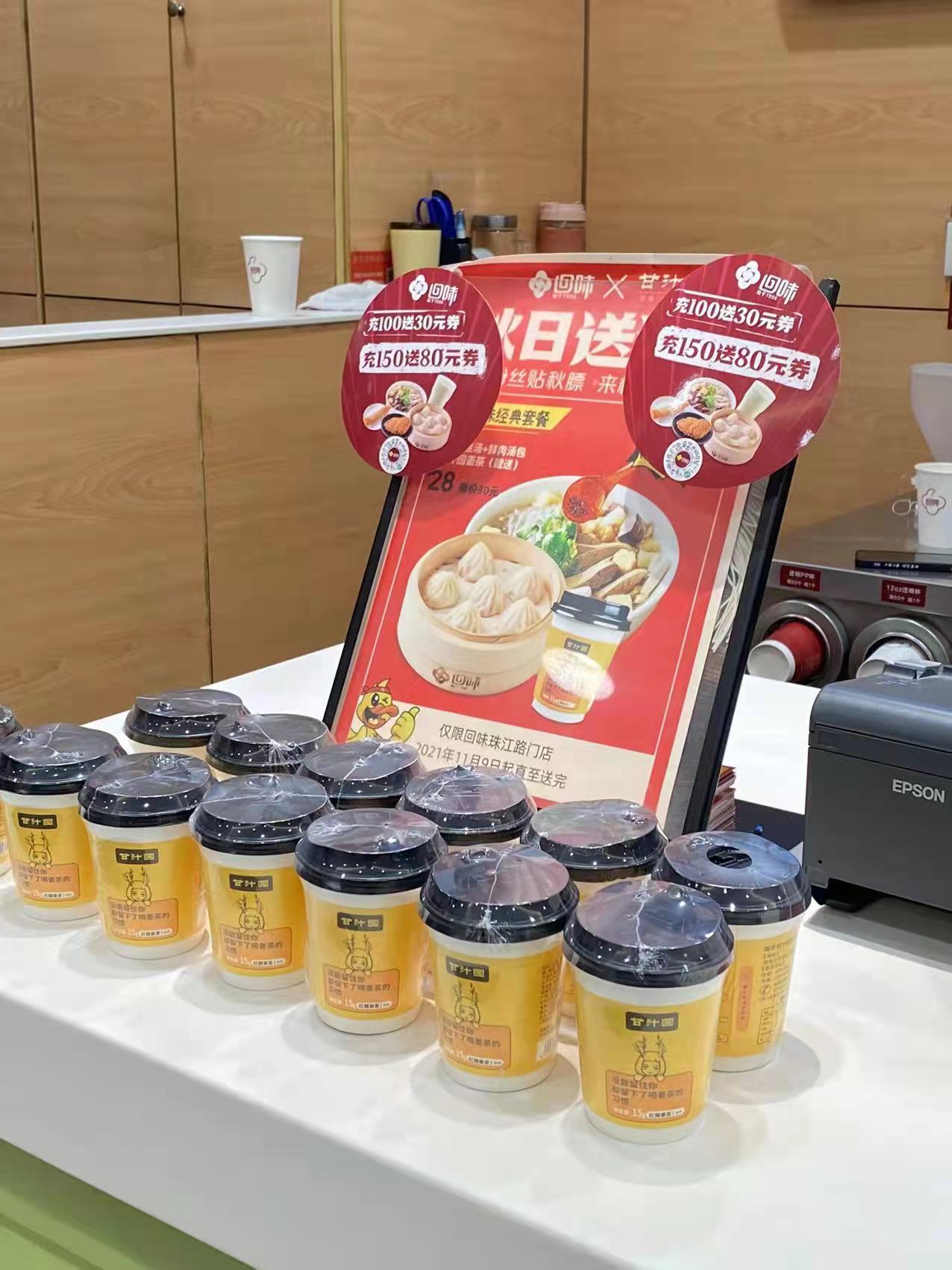 从11月9日开始,每一位在回味珠江路门店购买回味经典套餐的顾客都可以免费领取一杯甘汁园姜茶。一碗粉丝、一杯姜茶,可谓是寒冷冬季里的绝代双骄。