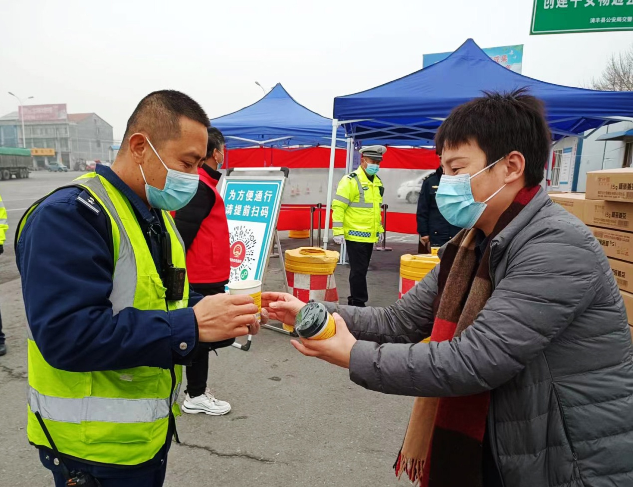 他们将这些姜汤全部捐给了收费站的工作人员和每天在此处指挥交通的交警同志。