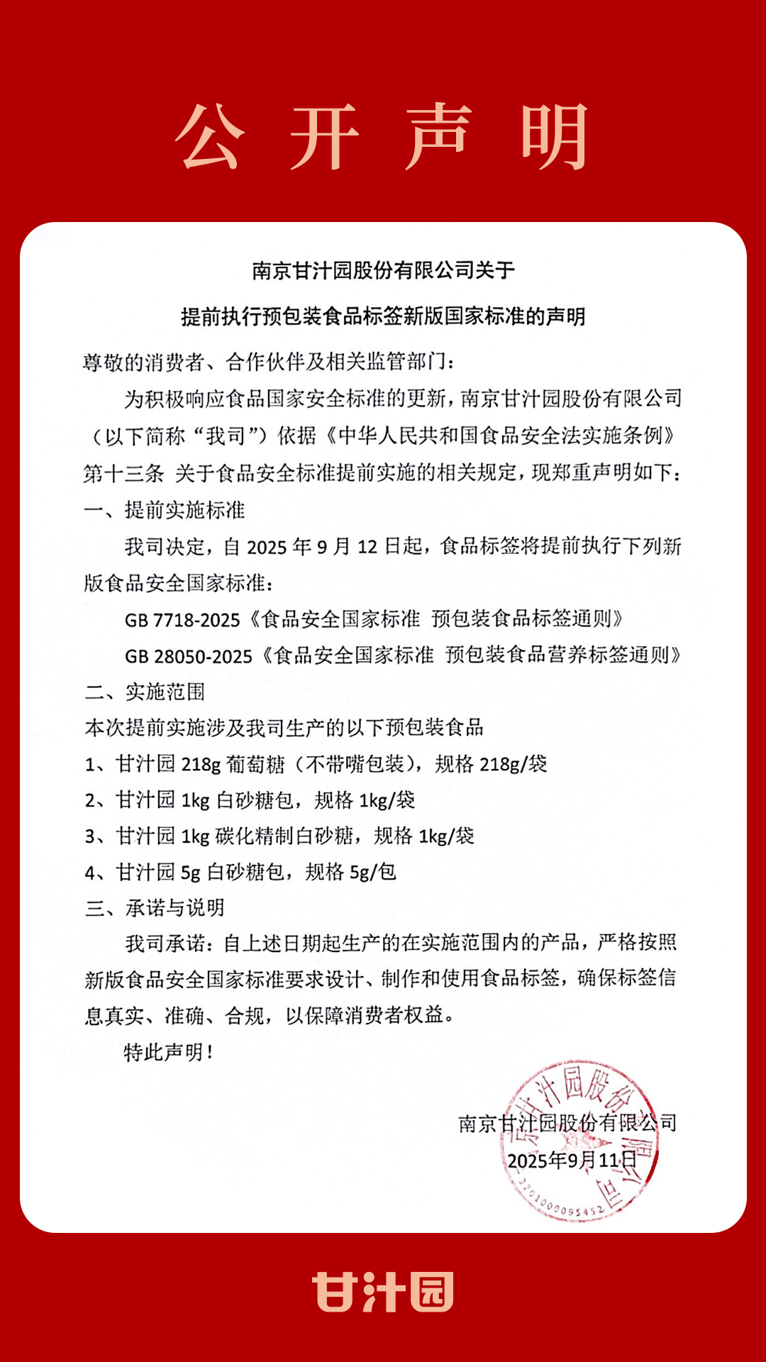 南京甘汁园股份有限公司关于提前执行预包装食品标签新版国家标准的声明