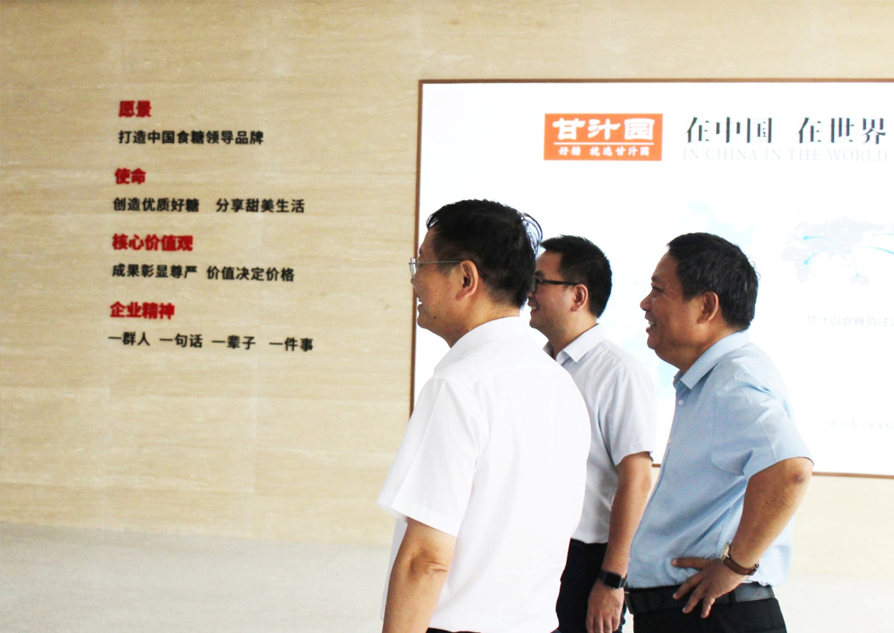 8月24日下午,全国制糖标准化技术委员会秘书长郭剑雄、国家糖业质量监督检验中心主任高裕锋率领国家糖检中心团队访问甘汁园股份有限公司,公司董事长蔡铁华、总经理蔡智全在盛安大道新总部接待了来访的嘉宾。