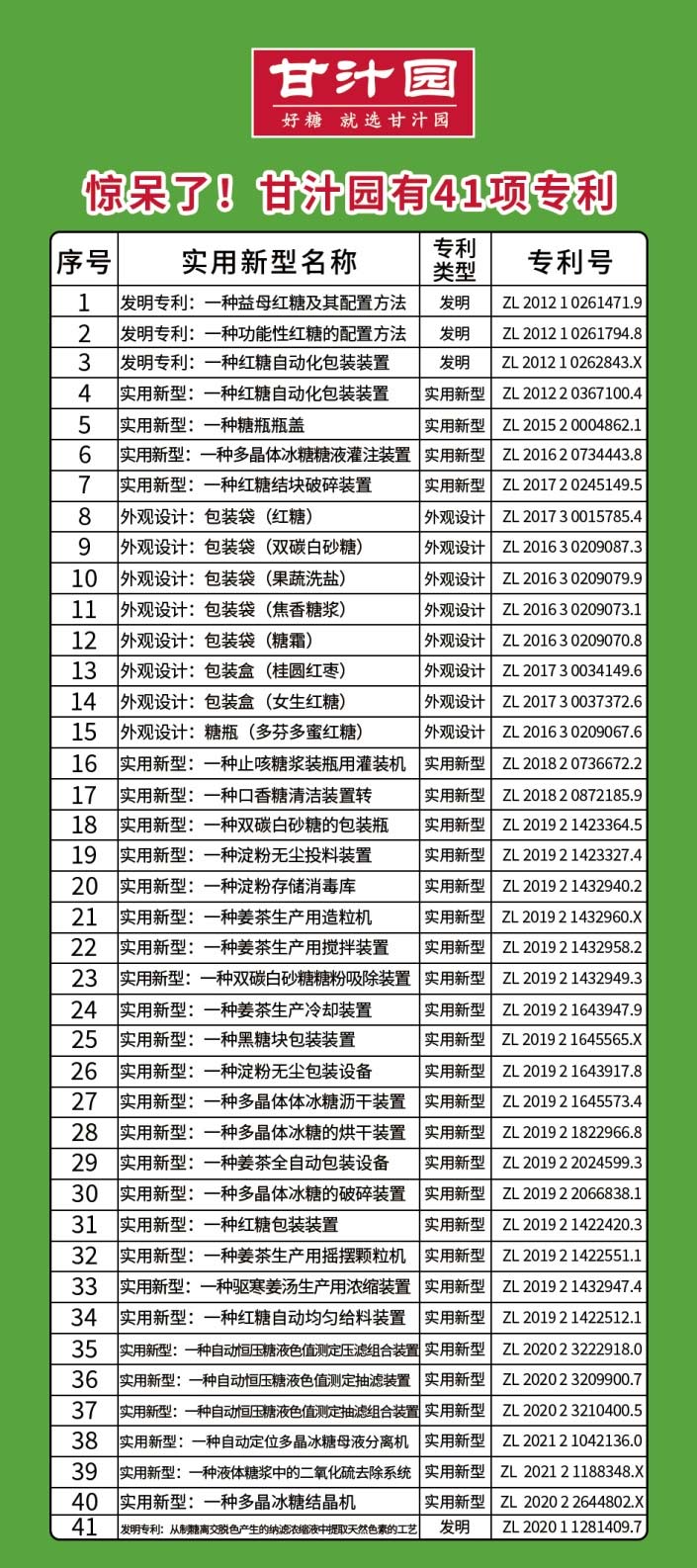 2022以来,甘汁园又获得了国家知识产权局授权的三项专利,分别是发明专利《从制糖离交脱色产生的纳滤浓缩液中提取天然色素的工艺》(专利号 ZL 2020 1 1281409.7)、实用新型专利《一种自动定位多晶冰糖母液分离机》(专利号ZL 2021 2 1042136.0)、实用新型《一种液体糖浆中的二氧化硫去除系统》(专利号ZL 2021 2 1188348.X),至此,甘汁园股份共计拥有41项发明或实用新型专利。