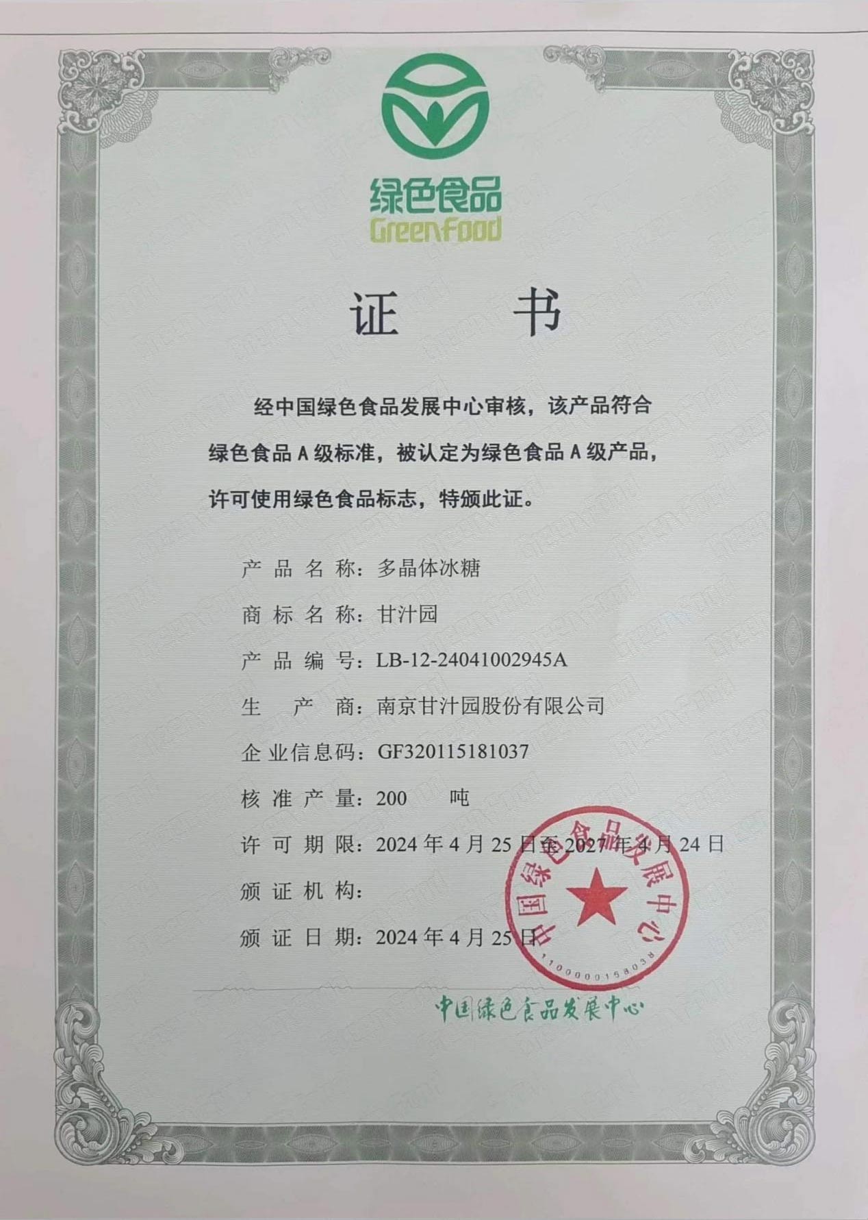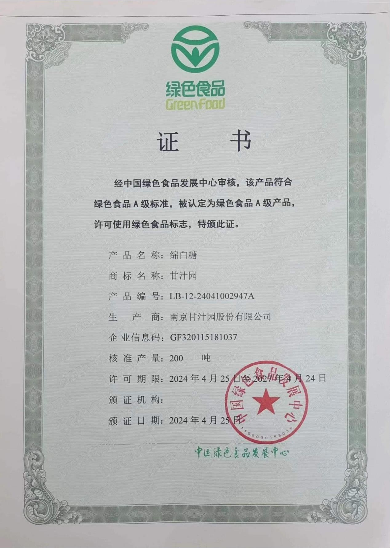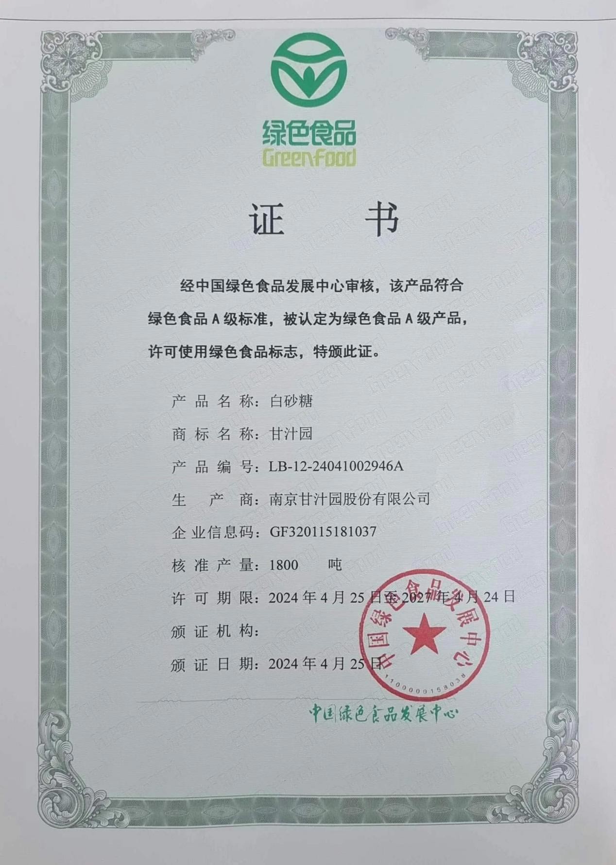 绿色食品,是指产自优良生态环境、按照绿色食品标准生产、实行全程质量控制并获得绿色食品标志使用权的安全、优质食用农产品及相关产品。绿色食品认证每3年认证一次,甘汁园系列产品2018年首次获得绿色食品认证,本次认证有效期将从2024年4月25日起至2027年4月24日。此次认证白砂糖核准产量1800吨、多晶体冰糖和绵白糖产量各为200吨。