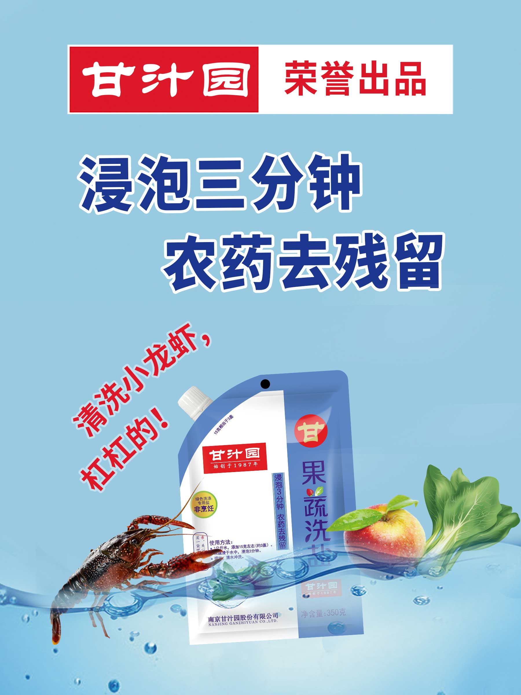甘汁园果蔬洗盐主要配料为食盐和食用小苏打,由于采用了食品级配方,在果蔬清洗方面更让消费者放心和安心。南京某龙虾馆老板很快发现它在清洗龙虾时能大显身手,因此,一条短视频在抖音传播,让果蔬洗盐再度爆红。