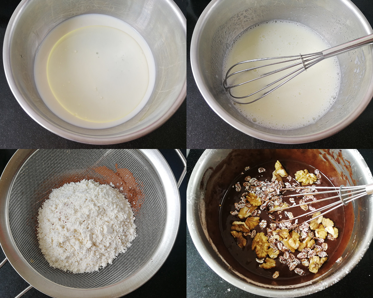 3、将高筋面粉、无糖可可粉,过筛加在上面的糖油奶液里,并拌匀;再放入碎核桃,黑麦片;